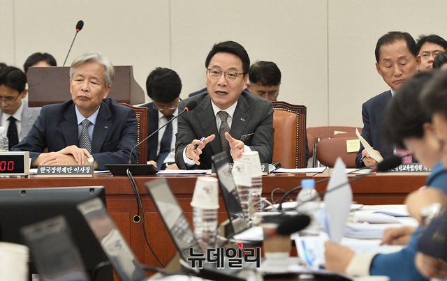 김헌영 한국대학교육협의회 회장이 4일 오후 국회에서 열린 교육부 소관 공공기관 및 유관기관 등에 대한 국정감사에 출석해 의원들의 질문에 답하고 있다.