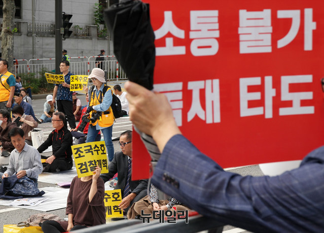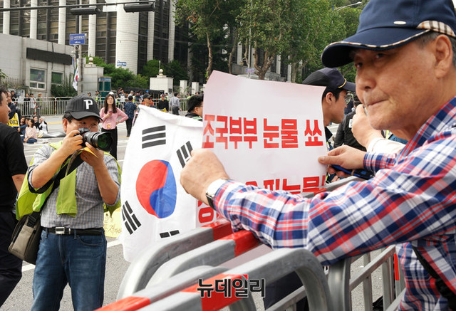 조국수호 촛불집회와 조국퇴진 촉구집회가 열리는 5일 오후 서울 서초구 서초경찰서 앞에서 시민들이 손 피켓을 들고 대립하고 있다.