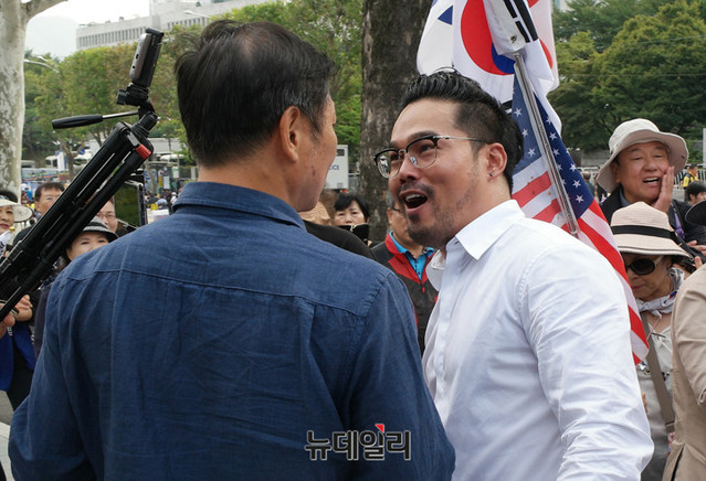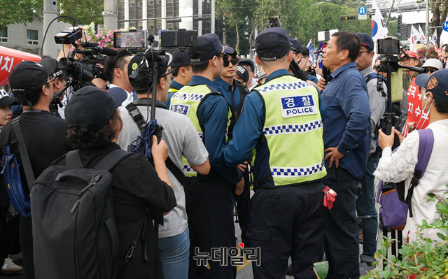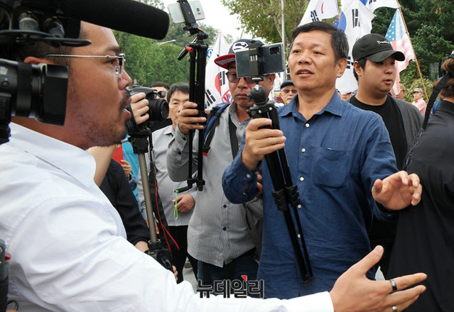 안정권 GZSS 대표와 김창호 동해일출tv 유튜버가 5일 오후 서울 서초구 서초경찰서 앞에서 열린 조국 수호 촛불집회 행사장 인근에서 고성을 지르며 대립하고 있다.