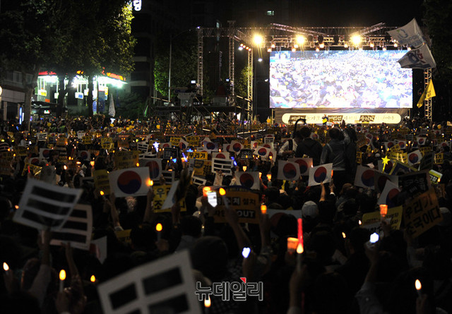 조국 찬반 집회가 열린 5일 오후 서울 서초역 인근에서 열린 제 8차 사법적폐청산을 위한 검찰개혁 및 조국수호 촛불집회 참가자들이 LED 촛불을 들고 있다.