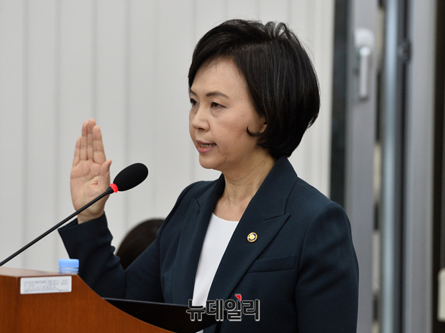 이의경 식품의약품안전처장이 7일 오전 국회에서 열린 보건복지위원회의 식품의약품안전처 국정감사에 출석해 선서를 하고 있다.