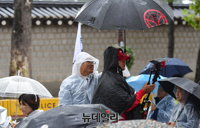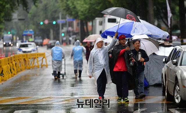 농성장엔 밤새 내린 비로 담요와 기자재가 젖었다. 임시로 설치한 비닐은 곳곳에 구멍이 난 상태다. 오후 4시에는 단체 삭발식이 예정돼 있다.