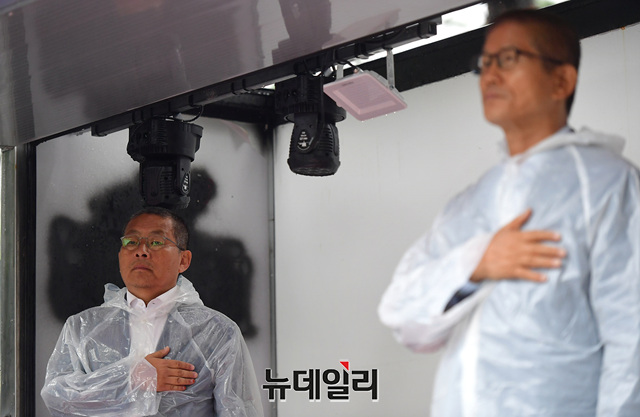 차명진 전 의원과 김문수 전 경기지사가 7일 오전 청와대 인근 효자로에서 지난 3일 밤부터 문재인 하야와 조국 사퇴를 촉구하며 5일째 밤샘 철야농성 중인 현장에서 집회를 앞두고 국민의례를 하고 있다.