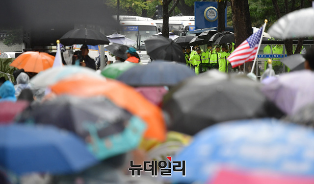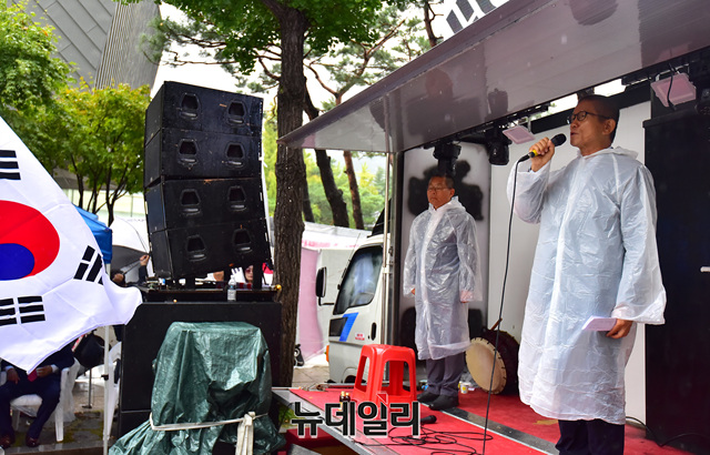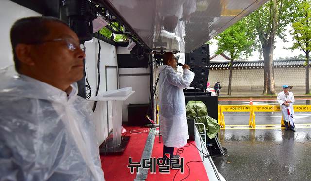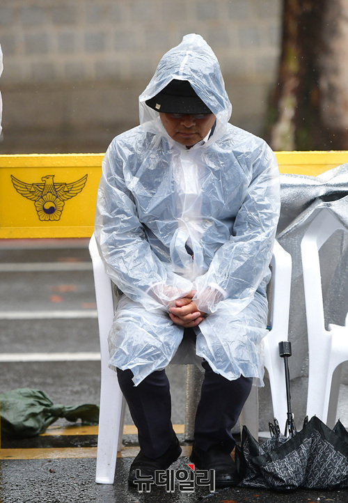 농성장엔 밤새 내린 비로 담요와 기자재가 젖었다. 임시로 설치한 비닐은 곳곳에 구멍이 난 상태다. 농성장에는 약 300여 명의 시민들이 집회를 이어가고 있다. 오후 4시에는 단체 삭발식이 예정돼 있다.