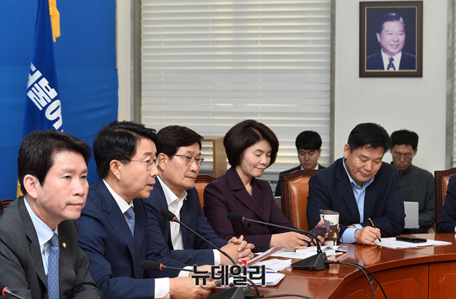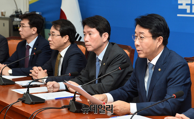 조정식 더불어민주당 정책위의장이 8일 오전 국회에서 열린 원내대책회의·상임위 간사단 연석회의에서 모두발언을 하고 있다.