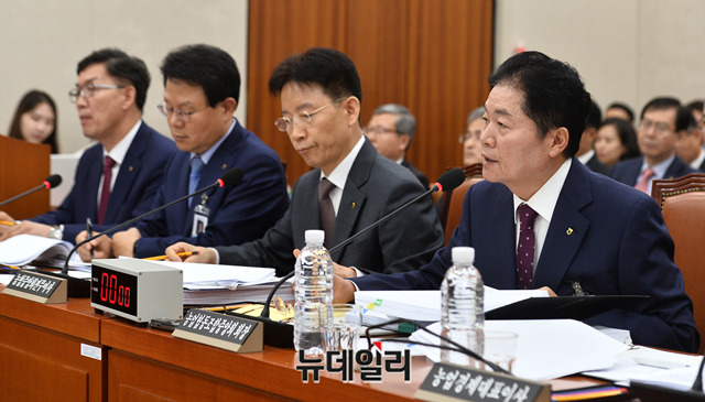김병원 농협중앙회 회장이 8일 오전 국회에서 열린 국회 농림축산식품해양수산위원회 국정감사에 출석해 의원들의 질문에 답하고 있다.