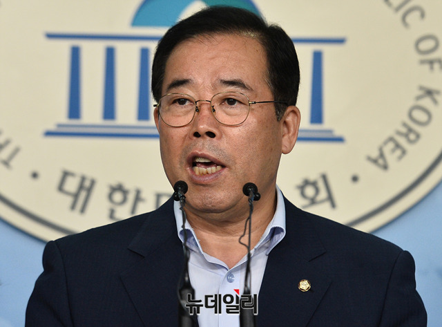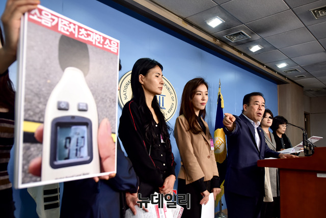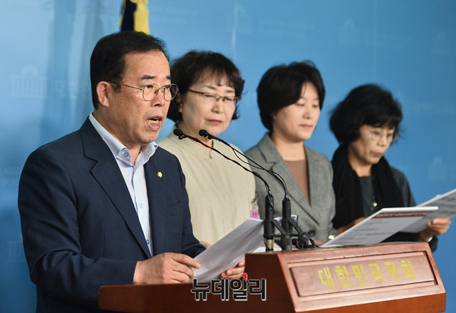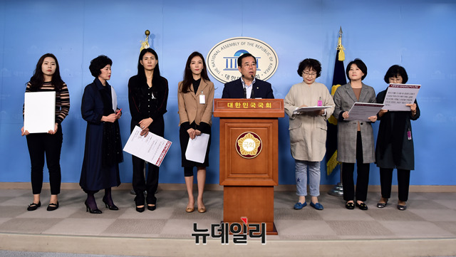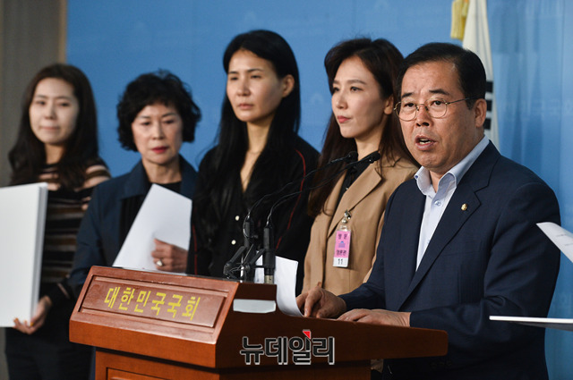 박성중 자유한국당 의원 및 서초동 주민들이 8일 오전 국회 정론관에서 '서초동 주민 피해주는 조국 법무부장관 지지 관제 데모 중단 촉구' 기자회견을 갖고 있다.