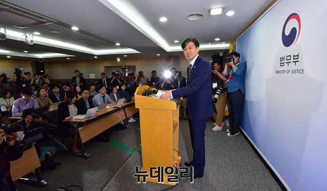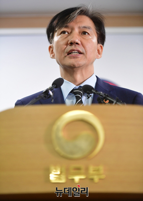 조국 법무부 장관이 8일 오후 경기 과천시 정부과천청사에서 검찰개혁 추진계획에 대한 대국민 보고를 하고 있다.