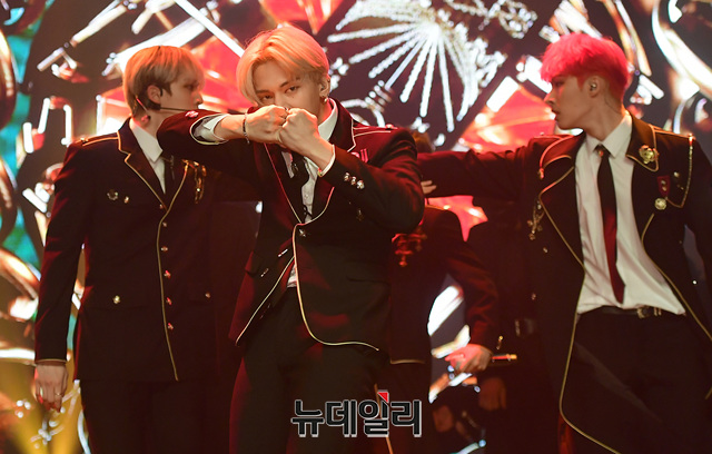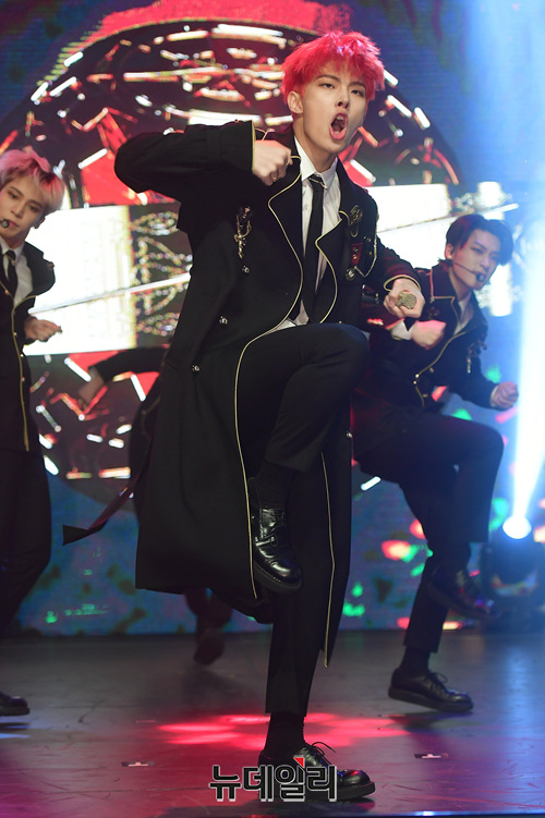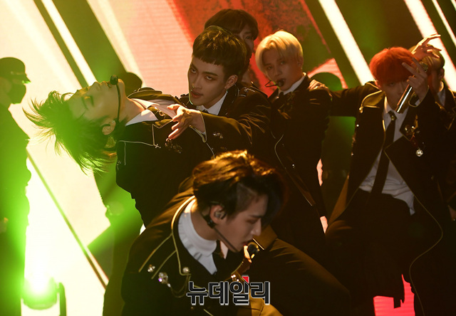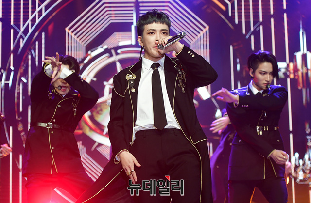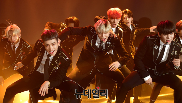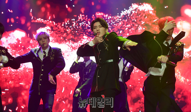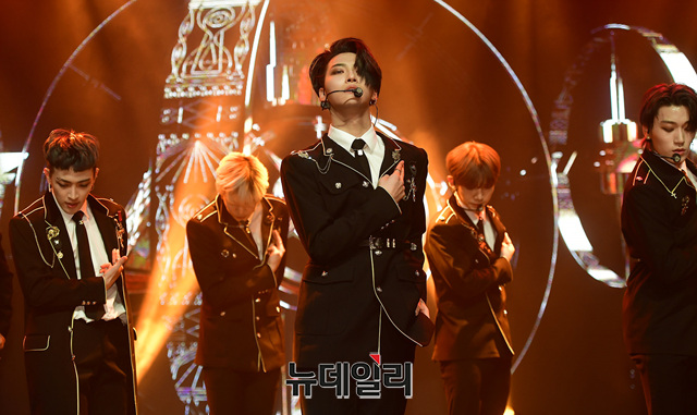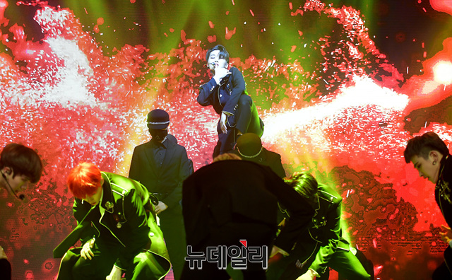 아이돌그룹 '에이티즈(ATEEZ)'가 8일 오후 서울 강남구 일지아트홀에서 첫 번째 정규앨범 '트레져 EP.핀 : 올 투 액션' 쇼케이스에서 타이틀곡 원더랜드를 선보이고 있다.