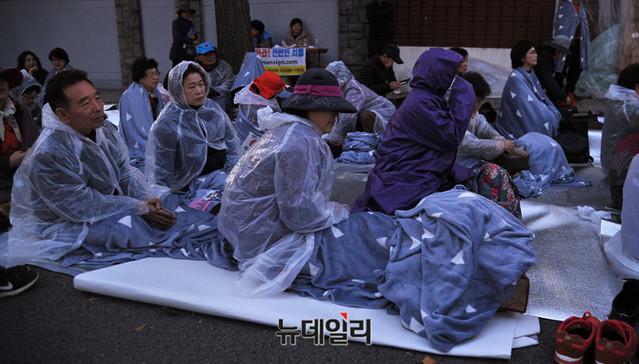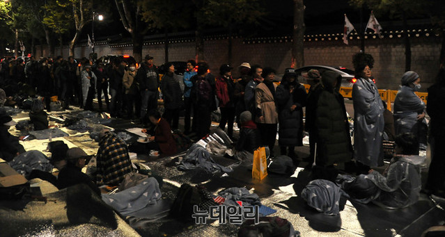 문재인 하야와 조국 사퇴를 촉구하며 6일째 밤샘 철야농성을 이어가고 있는 시민들이 8일 오후 청와대 인근 효자로 철야농성장에서 집회를 이어가고 있다.