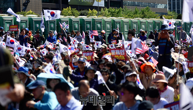 문재인·조국 퇴진을 촉구하는 자유시민들이 9일 오전 광화문 광장에 모여 태극기와 성조기를 들고 구호를 외치고 있다. 3일 연합집회에 이어 열린 이날 집회에는 간이화장실과 이동식 중계기가 설치됐다.