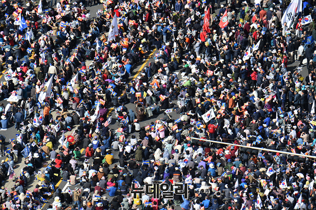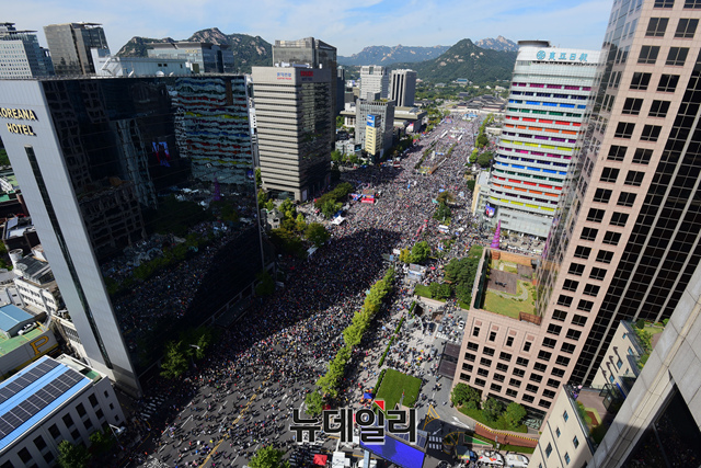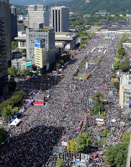 문재인·조국 퇴진을 촉구하는 자유시민들이 9일 오후 광화문 광장에 모여 태극기와 성조기를 들고 구호를 외치고 있다. 3일 연합집회에 이어 열린 이날 집회에는 간이화장실과 이동식 중계기가 설치됐다.