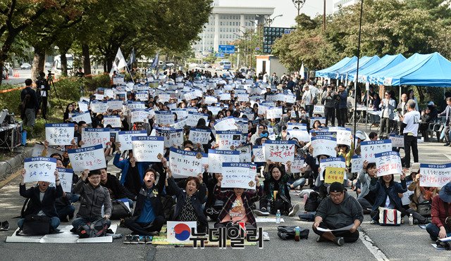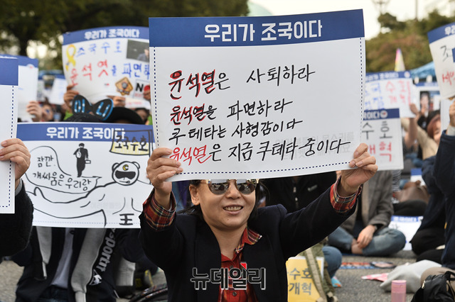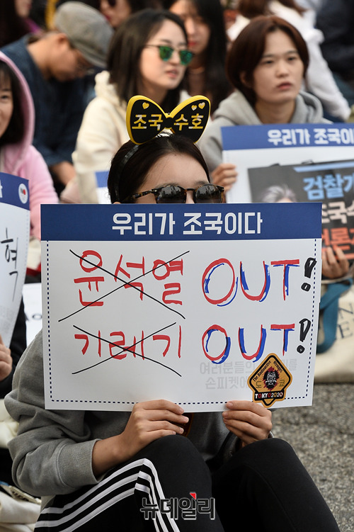 온라인 커뮤니티 '루리웹' 이용자들로 구성된 좌파단체 '북유게 사람들'이 9일 오후 서울 여의도공원 사거리에서 열린 '우리가 조국이다' 집회에서 피켓을 들고 구호를 외치고 있다.