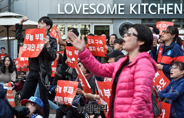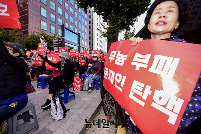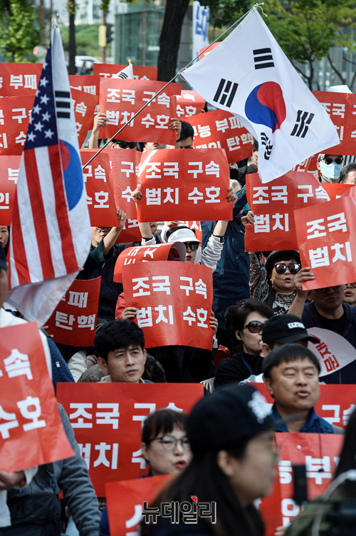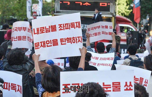 자유연대 및 우파단체가 9일 오후 서울 여의도공원 사거리에서 열린 '조국 장관 규탄' 집회에서 손피켓을 들고 구호를 외치고 있다. 이날 문재인 정권 규탄과 조국 파면을 요구하며 모인 시민들은 광화문광장에서 동시다발적으로 집회를 개최했다.