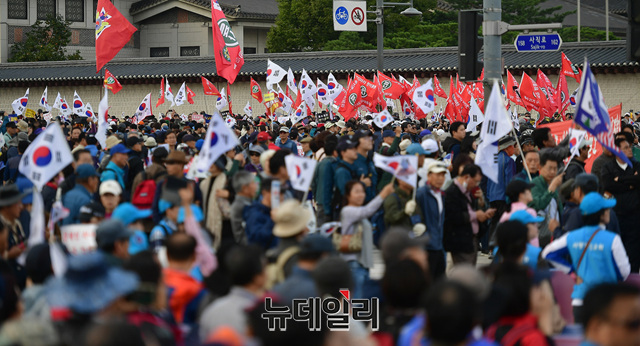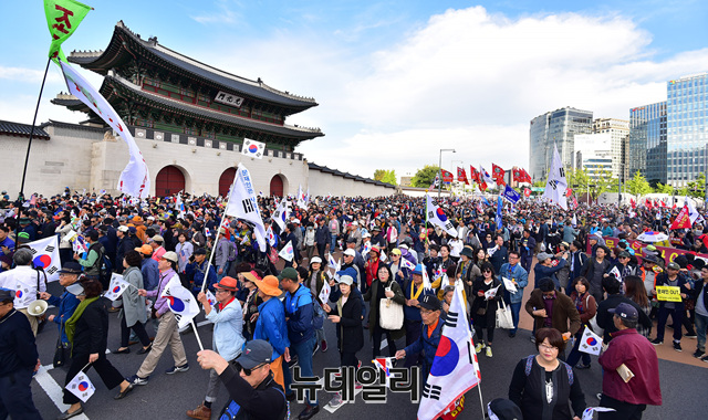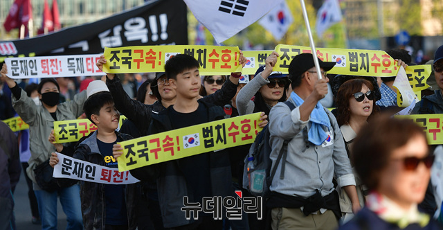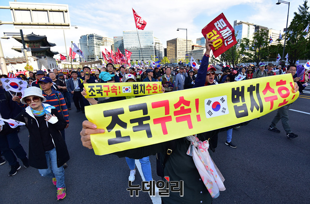 문재인·조국 규탄 집회에 참석한 시민들이 9일 오후 광화문 광장에서 진행된 대회 직후 청와대 방향으로 가두행진을 하고 있다. 이들은 행진하며 '문재인 하야, 조국 구속'의 구호를 외쳤다. 오후 5시 현재 청와대 방향 효자로는 집회 시민들로 가득차 통행이 불가능 하다.