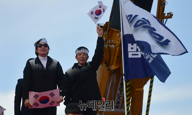 박상학 자유북한운동연합 대표가 9일 오후 광화문 광장에서 진행된 문재인-조국 규탄 집회에 참석해 태극기를 흔들고 있다. 집회 직후 시민들은 청와대 방향으로 나눠 행진하며 '문재인 하야, 조국 구속'의 구호를 외쳤다. 오후 5시 현재 청와대 방향 효자로는 집회 시민들로 가득차 통행이 불가능 하다.
