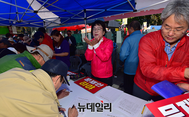황춘자 자유한국당 여성위원장이 9일 오후 서울 광화문광장에 차려진 조국 사퇴 국민서명 천막에서 시민들의 서명을 받고 있다. 이날 집회 직후 시민들은 청와대 방향으로 나눠 행진하며 '문재인 하야, 조국 구속'의 구호를 외쳤다.