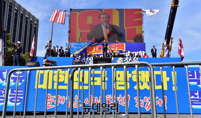 장경동 목사가 9일 오후 서울 광화문광장에서 열린 문재인·조국 규탄 집회 연단에 올라 발언하고 있다. 이날 집회 직후 시민들은 청와대 방향으로 나눠 행진하며 '문재인 하야, 조국 구속'의 구호를 외쳤다.