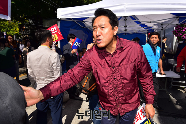 오세훈 전 서울시장이 9일 오후 서울 광화문광장에서 열린 문재인·조국 규탄 집회에 참석해 시민들과 인사를 하고 있다. 이날 집회 직후 시민들은 청와대 방향으로 나눠 행진하며 '문재인 하야, 조국 구속'의 구호를 외쳤다.