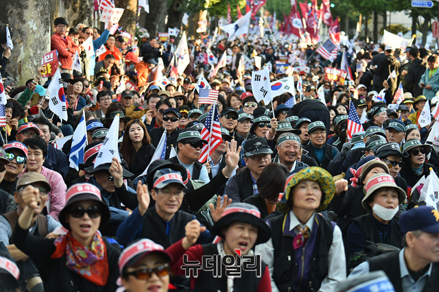 문재인·조국 규탄 집회에 참석한 시민들이 9일 오후 광화문 광장에서 진행된 대회 직후 청와대 분수대 인근에서 집회를 이어가고 있다. 이들은 '문재인 하야, 조국 구속'을 주장했다. 오후 6시 현재 청와대 방향 효자로는 집회 시민들로 가득차 통행이 불가능 하다.