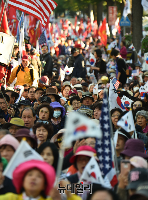 문재인·조국 규탄 집회에 참석한 시민들이 9일 오후 광화문 광장에서 진행된 대회 직후 청와대 분수대 인근에서 집회를 이어가고 있다. 이들은 '문재인 하야, 조국 구속'을 주장했다. 오후 6시 현재 청와대 방향 효자로는 집회 시민들로 가득차 통행이 불가능 하다.