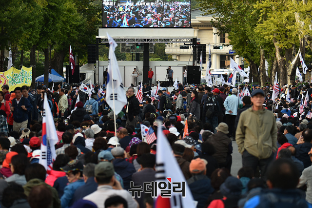 [포토] 청와대 사랑채 인근 집회 이어나가는 조국반대 시민들