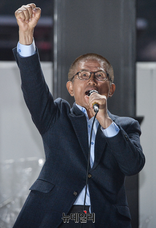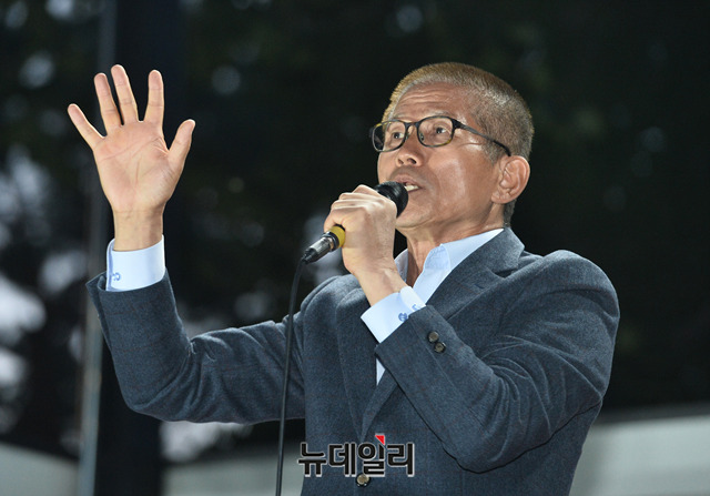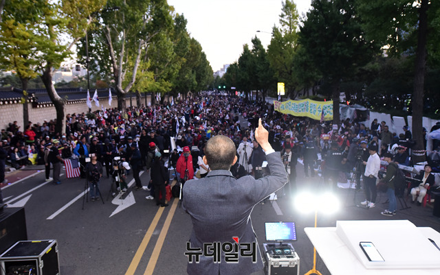 김문수 전 경기지사가 9일 오후 청와대 앞 효자로에서 열린 '문재인·조국 규탄 집회'에서 발언을 하고 있다.