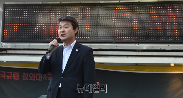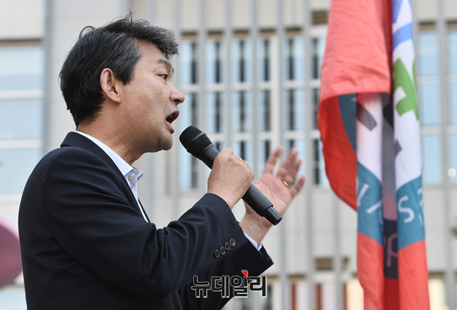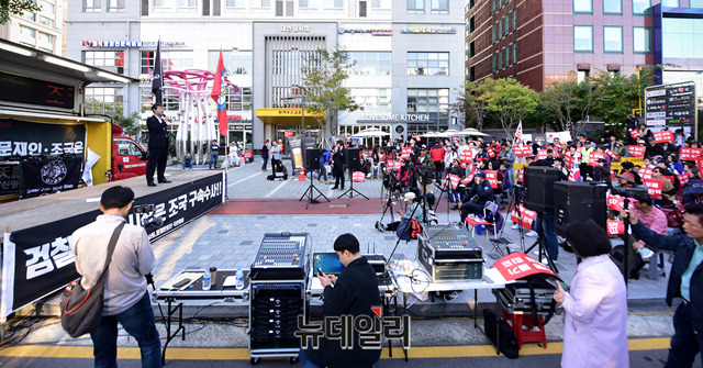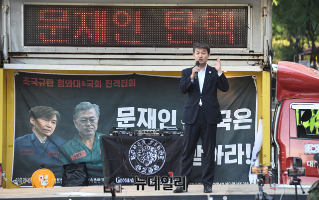 백승재 행동하는자유시민 공동대표가 9일 오후 서울 여의도공원 사거리에서 열린 '조국 장관 규탄' 집회에서 발언하고 있다. 이날 문재인 정권 규탄과 조국 파면을 요구하며 모인 시민들은 광화문광장 서울역 인근에서 동시다발적으로 집회를 개최했다.