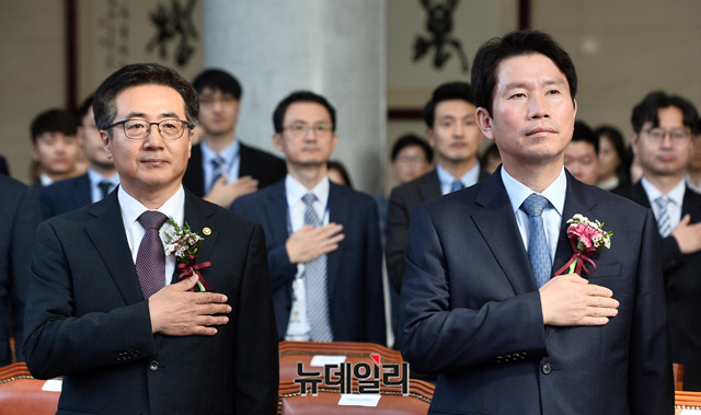 [포토] 국회예산정책처 설립 16주년 기념식, 국민의례하는 '이인영-이종후'