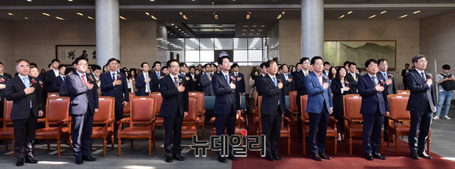 이인영 더불어민주당 원내대표와 이종후 국회예산정책처장 및 참석자들이 11일 오전 국회 의정관에서 열린 국회예산정책처 설립 16주년 기념식에서 국민의례를 하고 있다.