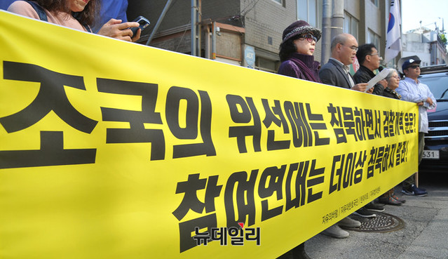 강민구 턴라이트 대표가 11일 오후 서울 종로구 참여연대 사무실 앞에서 열린 자유대한호국단, 턴라이트, 자유법치센터, 자유의바람 등이 공동 주최한 '조국사태 침묵하는 참여연대 규탄집회'에서 발언을 하고 있다.