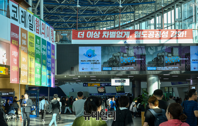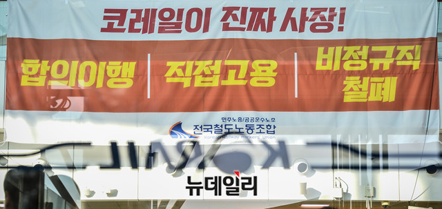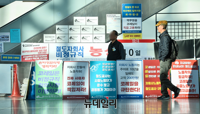 민노총 산하 철도노조가 파업에 들어간 11일 오후 서울역 역사안에서 요구사항이 적힌 현수막을 내걸고 농성을 하고 있다. 철도노조는 14일 오전 9시까지 농성을 이어간다.