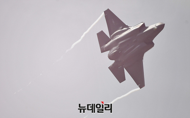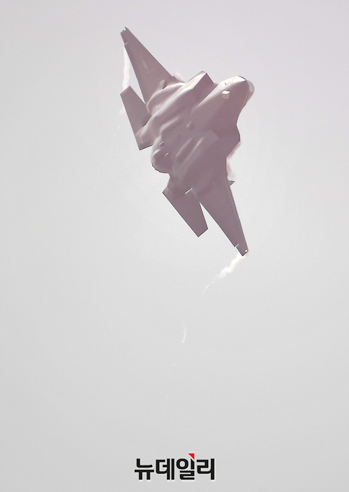 최신예 전투기 F-35A가 14일 오전 경기 성남시 서울공항에서 서울국제항공우주 및 방위산업 전시회2019(ADEX2019) 오픈을 앞두고 시험비행을 하고 있다.