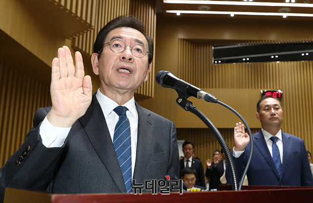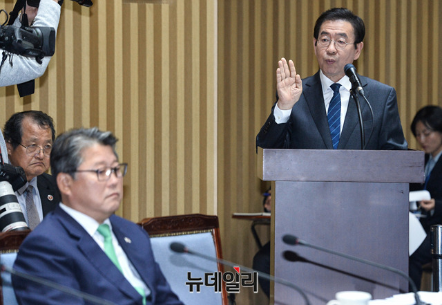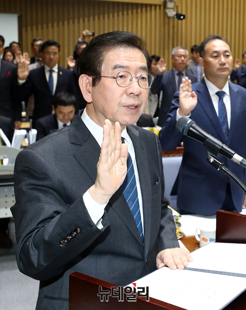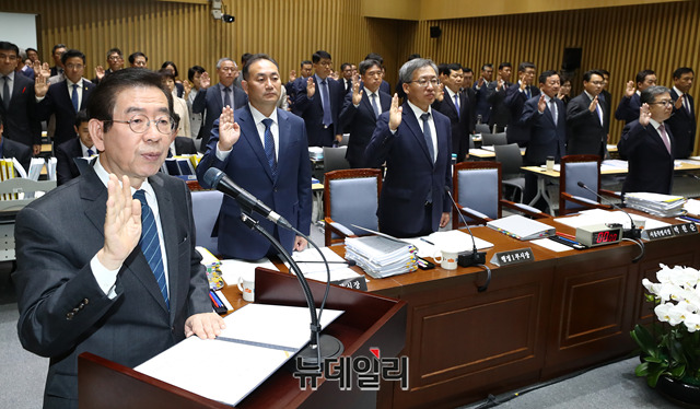 박원순 서울시장이 14일 오전 서울 중구 서울시청 대회의실에서 열린 국회 행정안전위원회의 서울시청 국정감사에서 증인선서를 하고 있다.