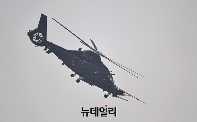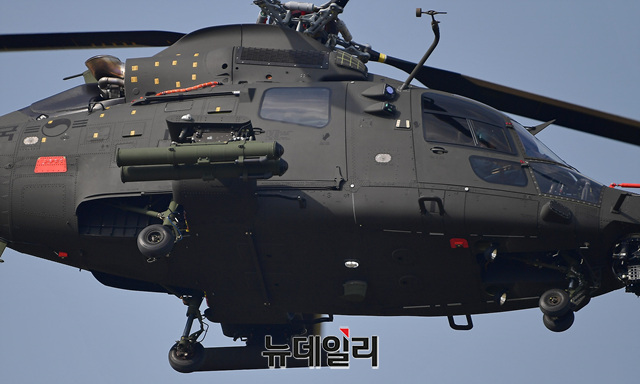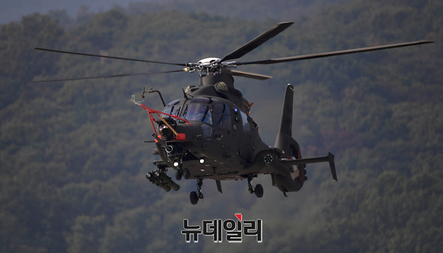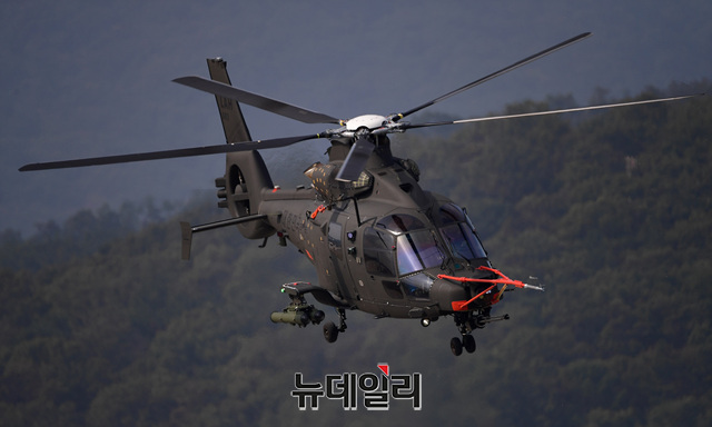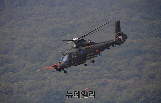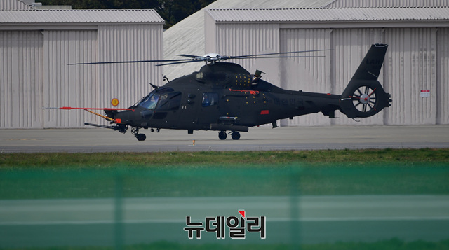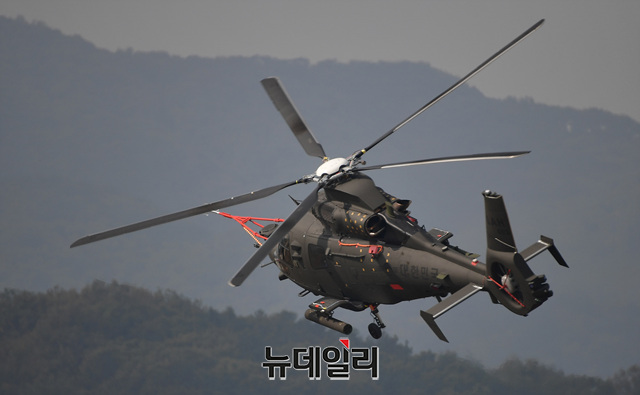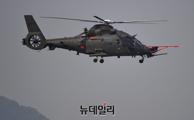 소형무장헬기 LAH가 14일 오전 경기 성남시 서울공항에서 '서울국제항공우주 및 방위산업 전시회2019(ADEX2019)' 개막을 앞두고 시험비행을 하고 있다.
