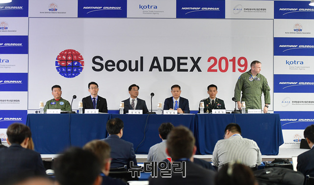 이상철 아덱스 TF장을 비롯한 참석자들이 14일 오전 경기 성남시 서울공항에서 '서울국제항공우주 및 방위산업 전시회2019(ADEX2019)' 개막을 앞두고 열린 기자회견에 자리하고 있다.
