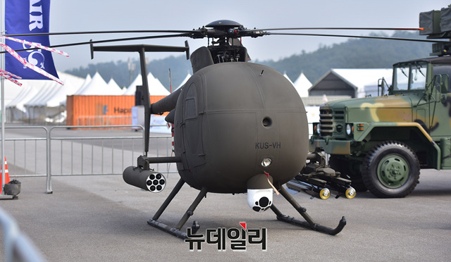 전술무인헬기 MD-500(KUS-VH)이 14일 오전 경기 성남시 서울공항에서 '서울국제항공우주 및 방위산업 전시회2019(ADEX2019)' 개막을 앞두고 전시돼 있다.