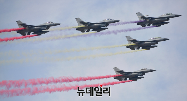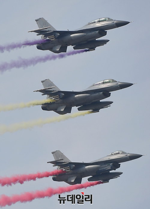 KF-16이 14일 오전 경기 성남시 서울공항에서 '서울국제항공우주 및 방위산업 전시회2019(ADEX2019)' 개막을 앞두고 연습비행을 하고 있다.