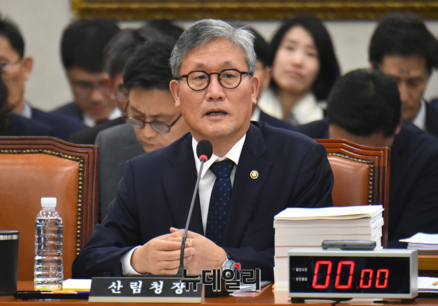 김재현 산림청장이 14일 오전 국회에서 열린 농림축산식품해양수산위원회, 산림청 산림조합중앙회 한국임업진흥원 등에 대한 국정감사에 참석해 의원들의 질문에 답하고 있다.