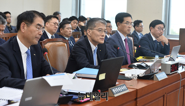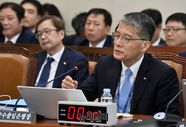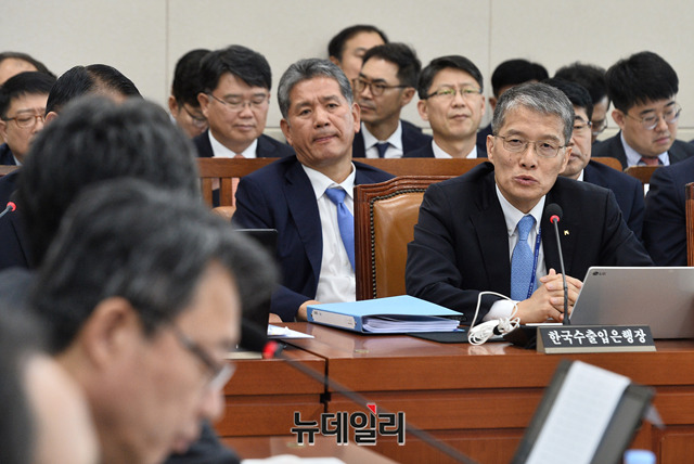 강승중 전무이사(한국수출입은행장 직무대행)가 14일 오후 국회에서 열린 기획재정위원회 국정감사에서 의원들의 질의에 답하고 있다.
