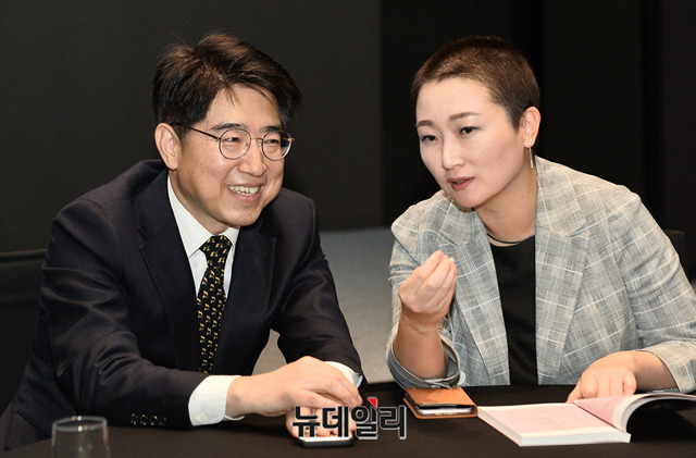 무소속 이언주 의원과 천영식 전 비서관이 14일 오후 서울 여의도 글래드호텔에서 열린 '천영식의 증언' 출판 기념 북콘서트에서 대화를 나누고 있다.