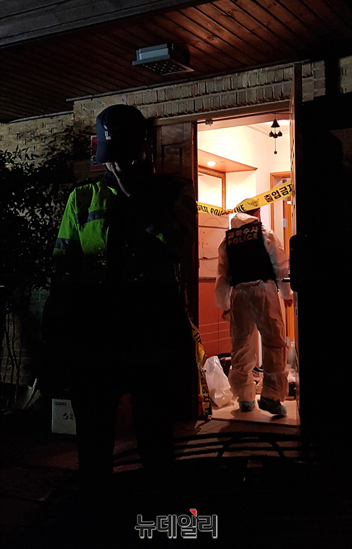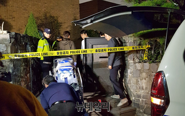 가수 겸 탤런트 설리(본명 최진리)가 경기 성남시 자택에 숨진채 발견된 14일 오후 관계자들이 들것을 들고 자택으로 들어서고 있다. 운구차량은 이날 오후 8시 40분께 자택에 도착했다. (경기 성남=조광형 기자)