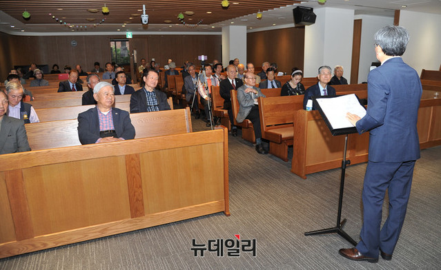 김광동 나라정책연구원장이 15일 오후 서울 중구 정동제일교회 아펜젤러홀에서 열린 제104회 이승만포럼에서 '한국 민주주의 혁명과 기독교적 기반'을 주제로 강연하고 있다.