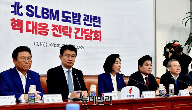 나경원 자유한국당 원내대표가 16일 오전 국회에서 열린 '北 SLBM 도발 관련 핵 대응 전략 간담회'에서 모두발언을 하고 있다.