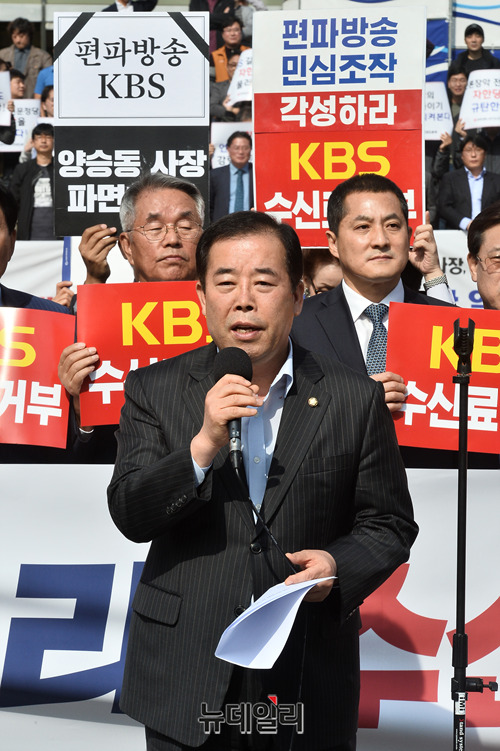 박성중 자유한국당 미디어특위 상임위원장이 16일 오전 서울 영등포구 KBS 정문 앞에서 열린 'KBS 편파보도 및 양승동 사장 사퇴 촉구 규탄대회'에서 발언을 하고 있다.