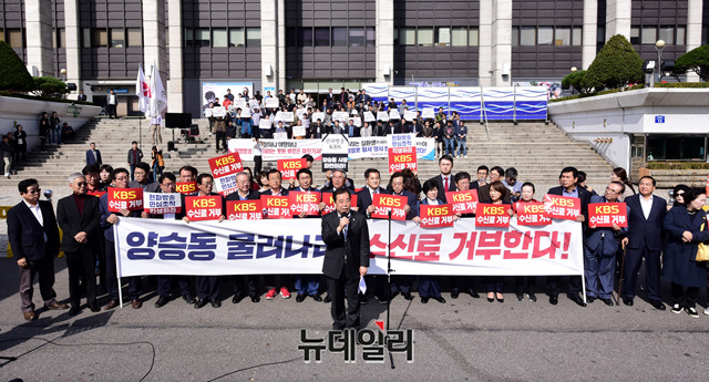같은 시간 한국당의 규탄대회를 저지하기 위해 민노총 산하 전국언론노동조합 KBS본부가 한국당을 규탄하는 맞불집회를 개최했다.