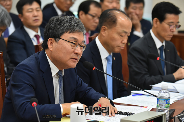 이상직 중소벤처기업진흥공단 이사장이 16일 오전 국회 산업통상자원중소벤처기업위원회에서 열린 국정감사에 출석해 의원들의 질문에 답하고 있다.