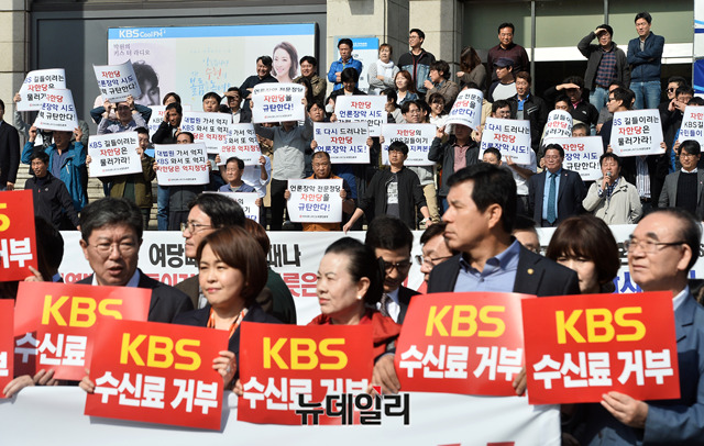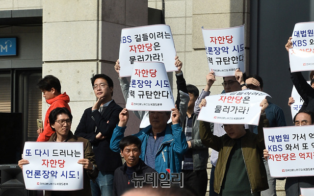민노총 산하 전국언론노동조합 KBS본부가 16일 오전 서울 영등포구 KBS 정문 앞에서 자유한국당 'KBS 편파보도 및 양승동 사장 사퇴 촉구 규탄대회'를 저지하기 위해 맞불집회를 하고 있다.