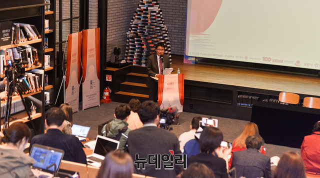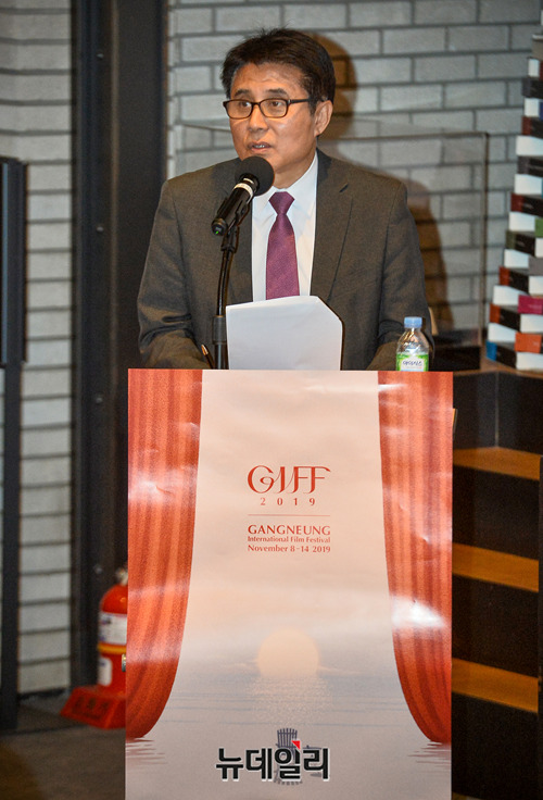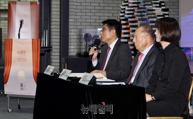 김홍준 예술감독이 16일 오후 서울 중구 CGV명동역점에서 열린 '제1회 강릉국제영화제' 공식 기자회견에서 영화제 소개를 하고 있다.