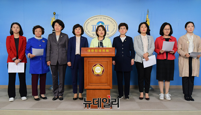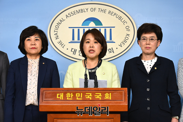 송희경 자유한국당 중앙여성위원장과 당 소속 여성 의원들이 17일 오후 국회 정론관에서 'KBS 여기자 성희롱 유튜브 방송 알릴레오 유시민 노무현재단 이사장 규탄' 회견을 하고 있다.